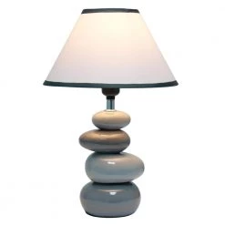 A fun, inexpensive, and practical table lamp set to meet your basic fashion lighting needs. These small lamps feature a stone shaped ceramic base and matching fabric shade. The compact size of these lamps make them the perfect bedside counterpart.