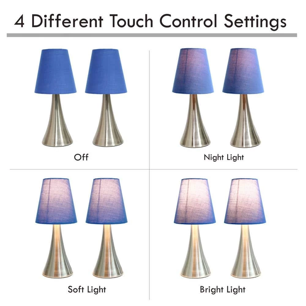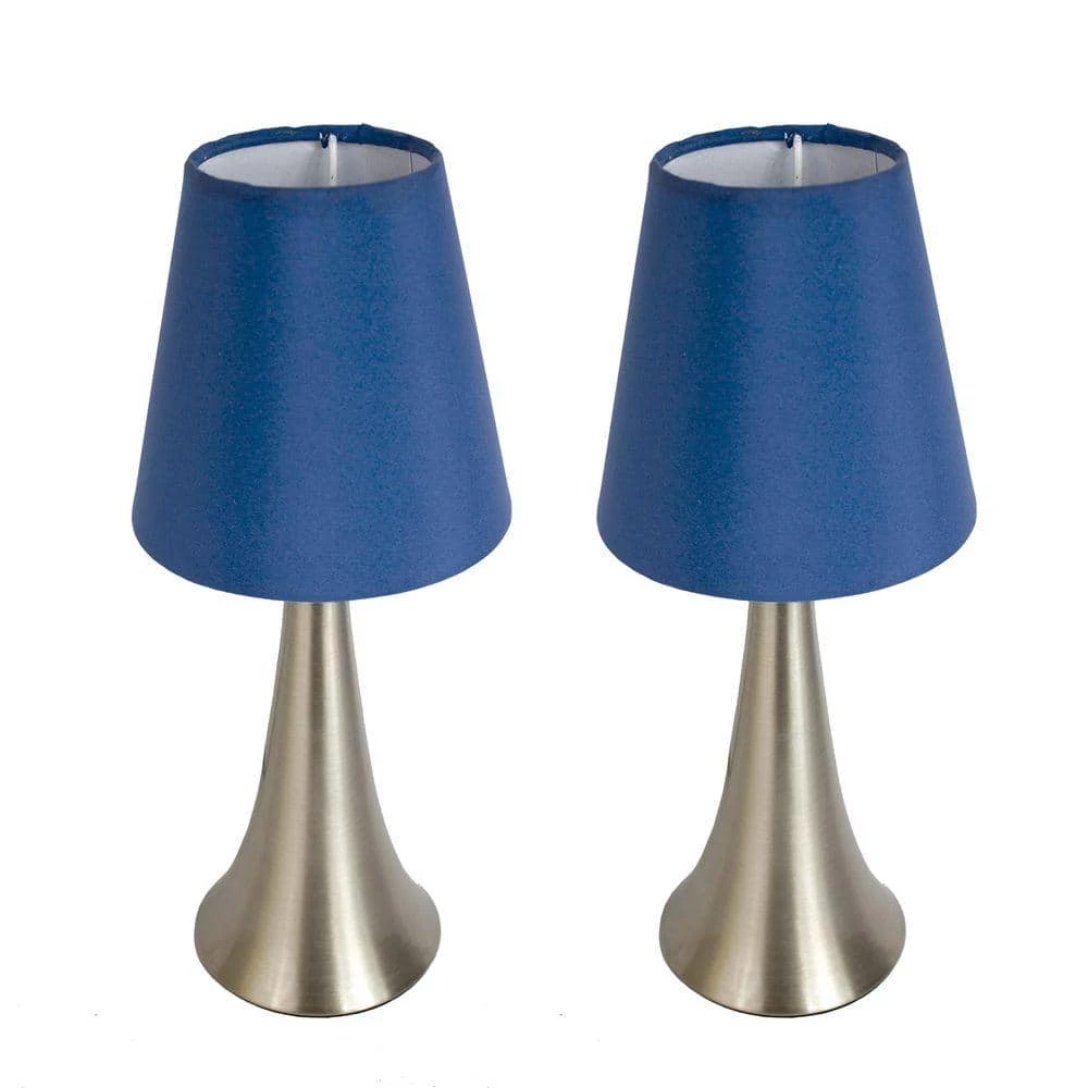 Add a contemporary feel to any room with these attractive brushed nickel mini touch lamps. Touch controls with 4 settings (low, medium, high, off). The blue fabric shades complete this modern look. Perfect lamp for bedroom night tables. We believe that lighting is like jewelry for your home. Our products will help to enhance your room with chic sophistication.