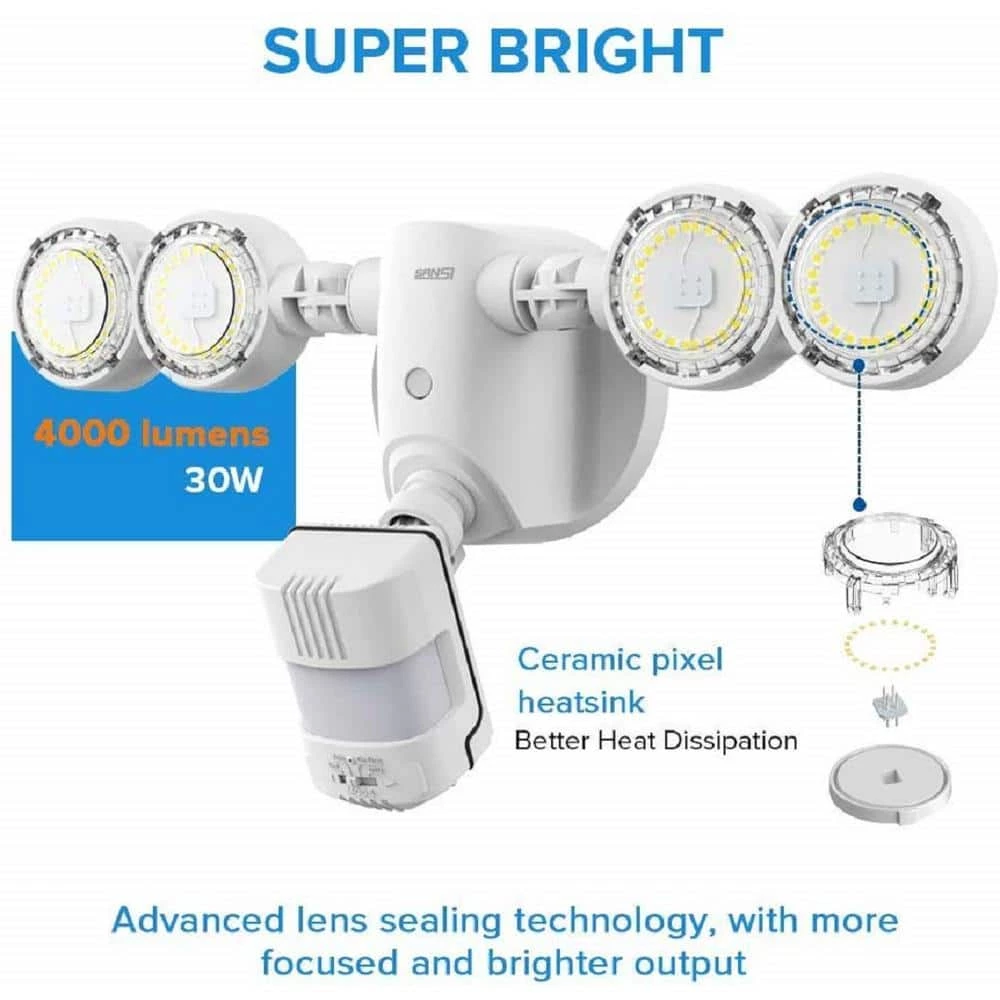Compared with other security lights, the SANSI’s LED security motion sensor light can produce up to 4000 Lumens high brightness and clear white light just with 30-Watt, which is far brighter to provide efficient lighting for your exterior living environment and adds extra safety for your home. The adjustable design allows you to choose your lighting area. It includes infrared motion sensor and adjustable features.