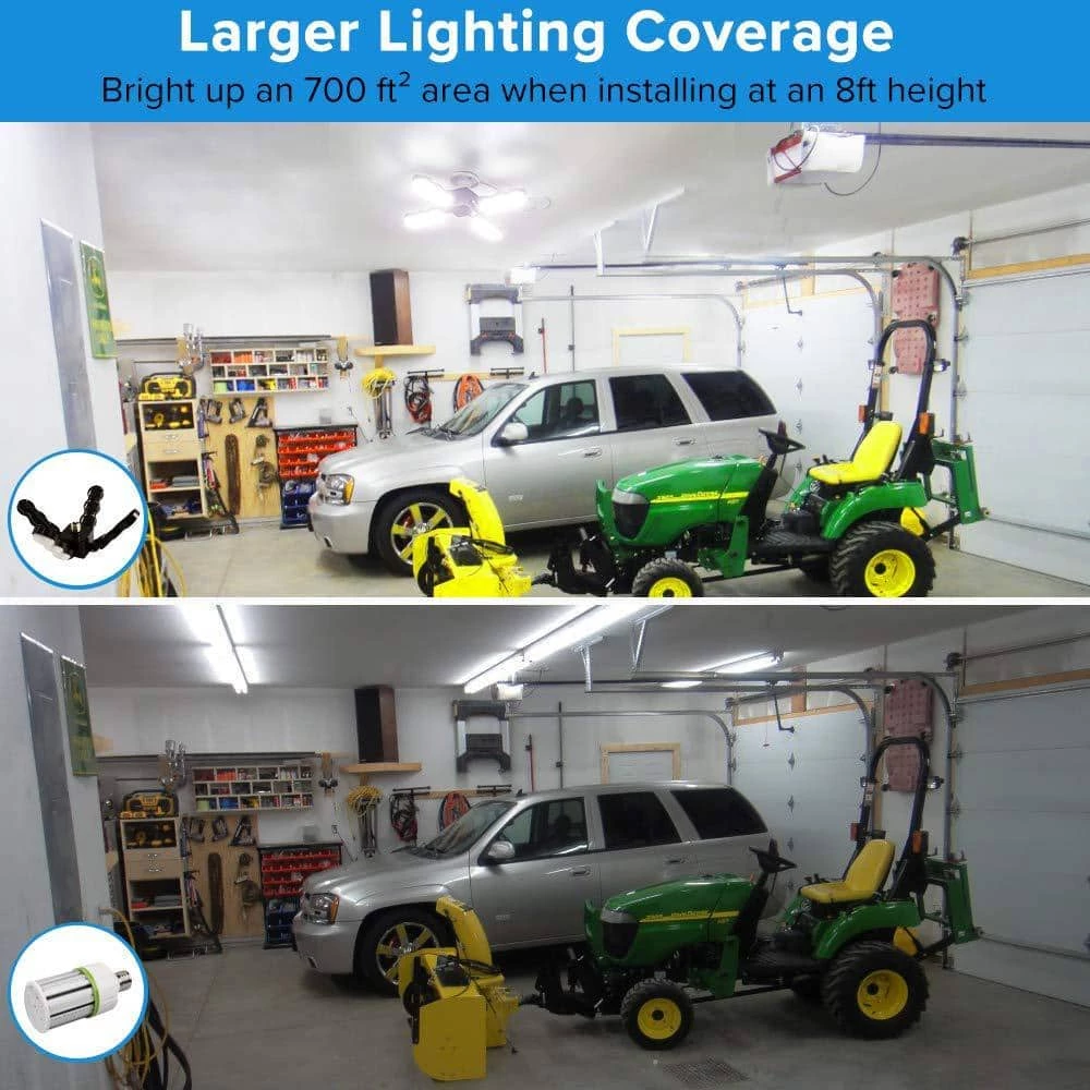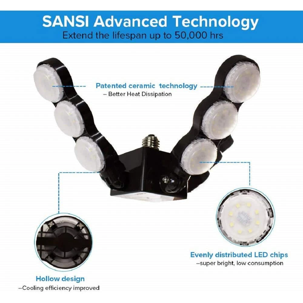 The SANSI 60W daylight LED garage light has a super bright 6000 Lumens output. Each LED chip has a 120° lighting beam angle ensuring the downwards light is even to the edges, unlike other brands. When installing at an 8 ft. H, it can illuminate an 700 sq. ft. to 800 sq. ft. area.