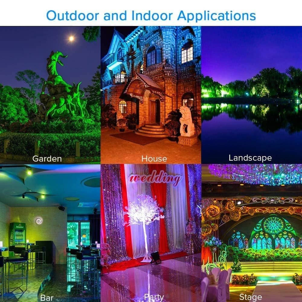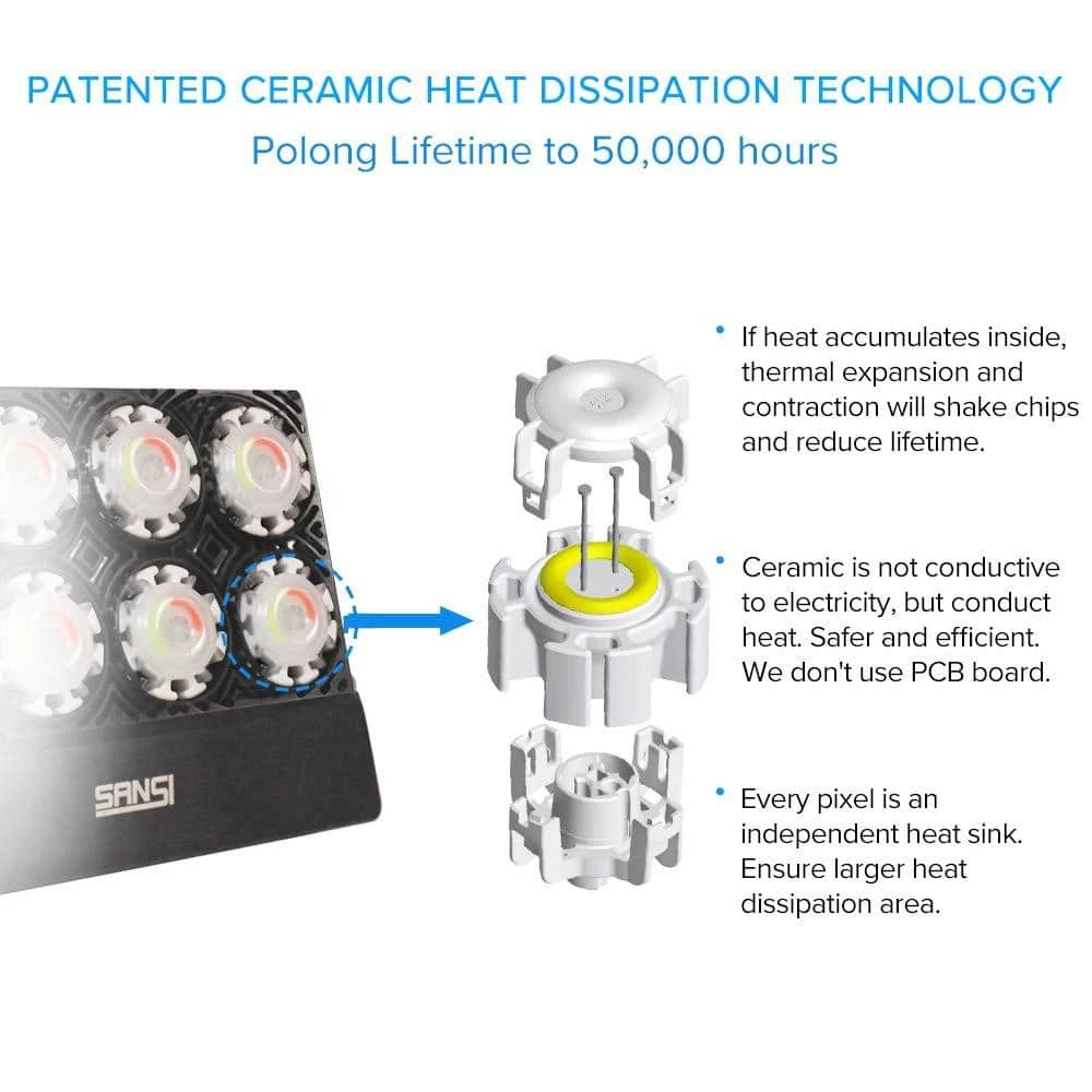 - Long lifetime: thanks to the fact that ceramic is not conductive to electricity but conduct heat, ceramic heat sink is the best choice for sake of safety and efficiency compared to aluminum, every RGB floodlight has 8-light sources (ceramic heat sink) to enlarge dissipation area, this patented technology prolongs lifetime effectively