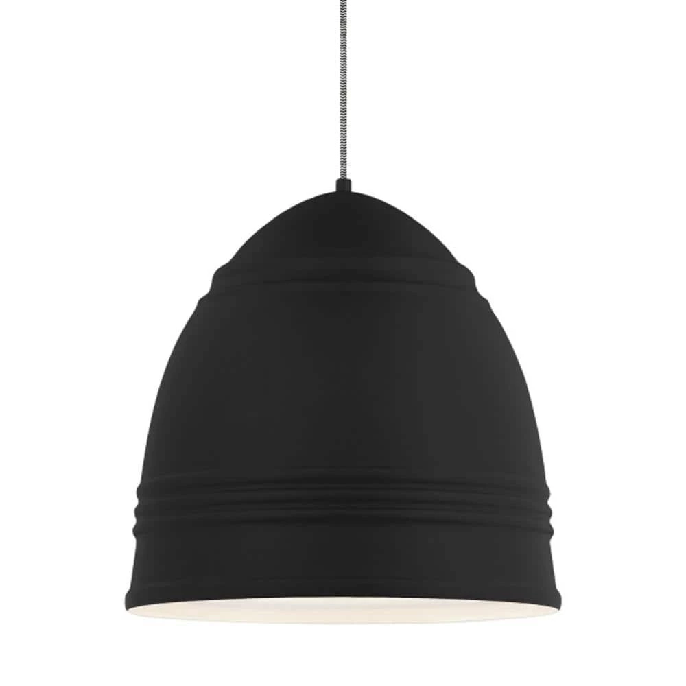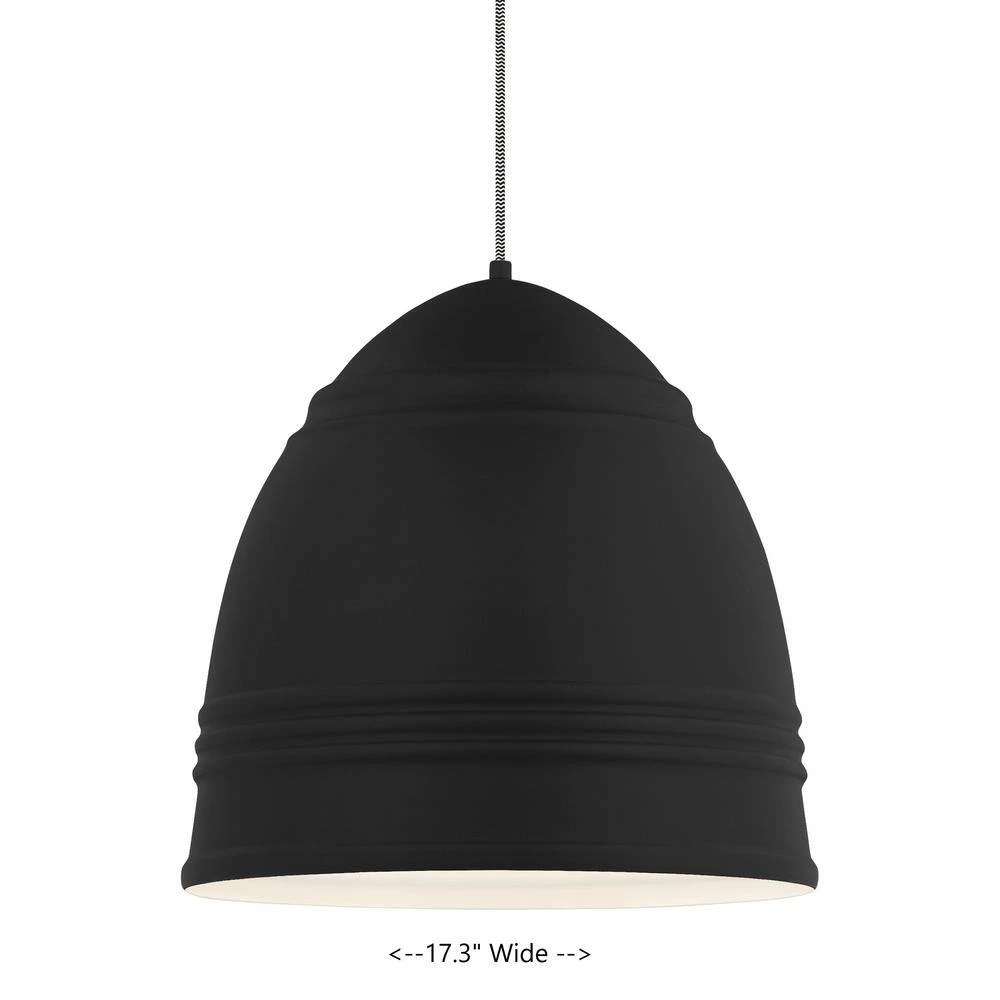 This stylized and elevated interpretation of industrial high bay lighting features rubberized paint on the ribbed spun-metal shade to provide a smooth, matte finish while a choice of metallic plated cage adds a custom look. Offered in 2 industrial finishes, rubberized black and brushed aluminum and the choice of 3 cage-finishes, black, copper and nickel or no-age at all. The Loft Grande Pendant applies an updated look to any industrial setting. This grand scale pendant has a diameter of 17.3 in. with a smaller option, Loft scaling at 11.6 in. Dia.